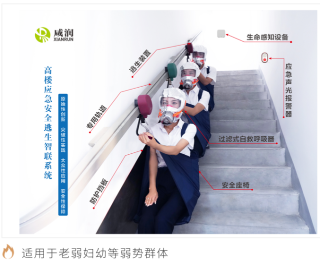 該系統可有效解決高層建筑及各類人員密集場所內涉險人員的群體性緊急疏散難題, 在傳統“防、消、救”的層面上,增加了“逃”的功能。當發生火災等緊急情況時,第一時間實現聯動報警,百米高層3分鐘快速逃生,高效有序撤離至地面安全地帶。同時結合物聯網+功能,對樓內人員進行生命探測、位置追蹤,為消防隊員提供精準救援信息,將主動自救互救和協同組織救援緊密結合,有效提高救援全過程質效,降低人員密集場所群死群傷重特大火災事故的發生幾率,扭轉重特大事故多發被動局面,減少人員傷亡及財產損失,全方面保障人民生命財產安全,填補人員密集場所緊急疏散基礎設施建設空白。